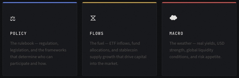 Regimes don't flip on a single candle. They flip on catalysts. And to identify those catalysts, you need to understand the three pillars that drive Bitcoin's price action.