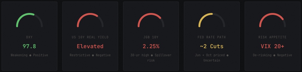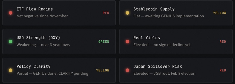 But regimes can shift faster than consensus expects. The February 8 Japan election, the February 17 FDIC comment deadline, the February jobs and CPI prints — any of these could be the catalyst that flips one or more lights from red to green.